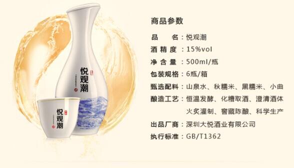 悦观潮,作为客家礼文化的经典之作,汇集了客家人的智慧,传递了健康的生活理念,成了目前消费者待客、送礼的首要选择。品一口悦观潮,15的度数不会让你翻江倒海,21种人体必需的氨基酸也不会让你头疼欲裂,甜美清醇里只会让你温柔着暖融融。从头到脚仿佛被温泉水沐浴着,飘飘然然满身惬意。如此美妙的感觉,客人怎能不爱呢!